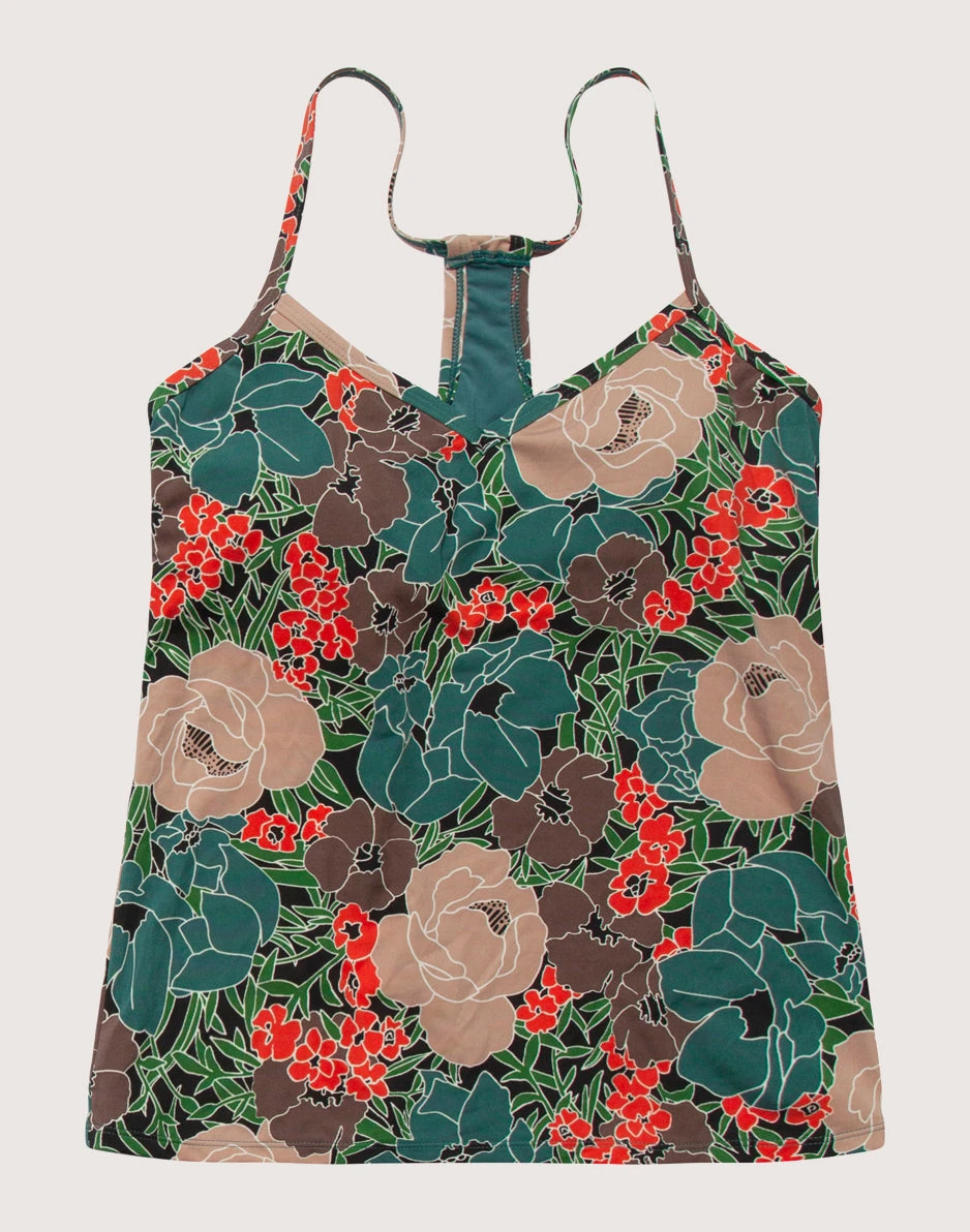 Based on our Stinson Bikini, the long torso of the tankini gives coverage where needed. The athletic t-back style is recommended for high levels of activity.